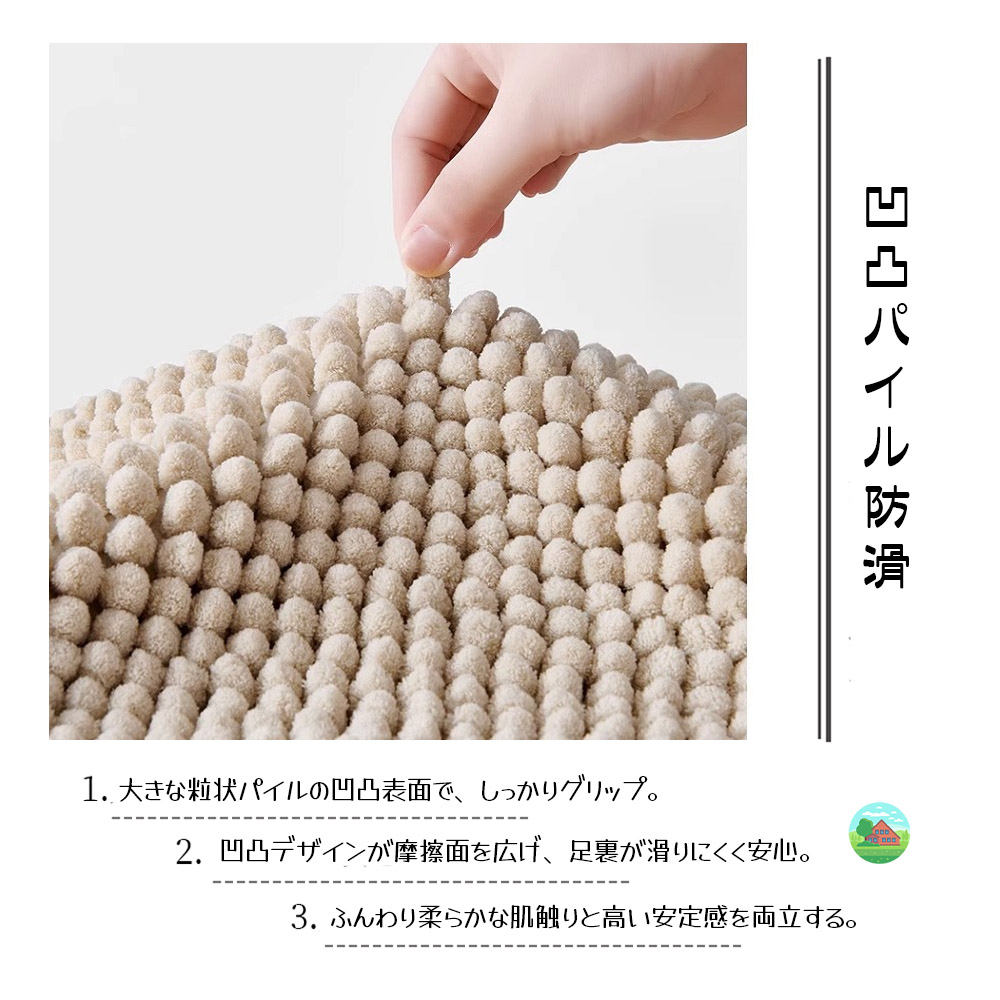 大きいパイル:厚みのある毛足で踏み心地ふかふか、浴室の雰囲気をアップ。