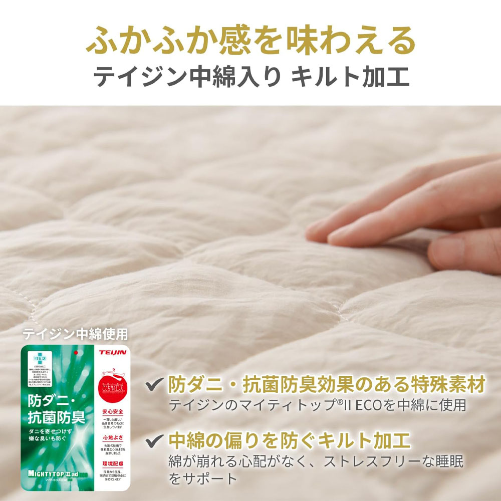 マットレスをしっかり包み込み、寝返りしてもズレにくい安定感のある設計。ボックスシーツ&敷きパッドの2役で使え、快適な寝姿勢をサポートします。
