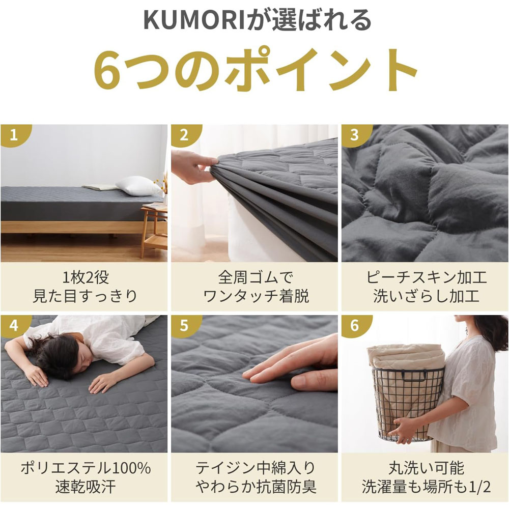 ベッドパッドとボックスシーツがひとつになった便利な一体型タイプ。全周ゴムでフィット感が高く、寝返りしてもズレにくい仕様です。ベッドメイキングが簡単に完了し、家事の負担を大幅に軽減します。