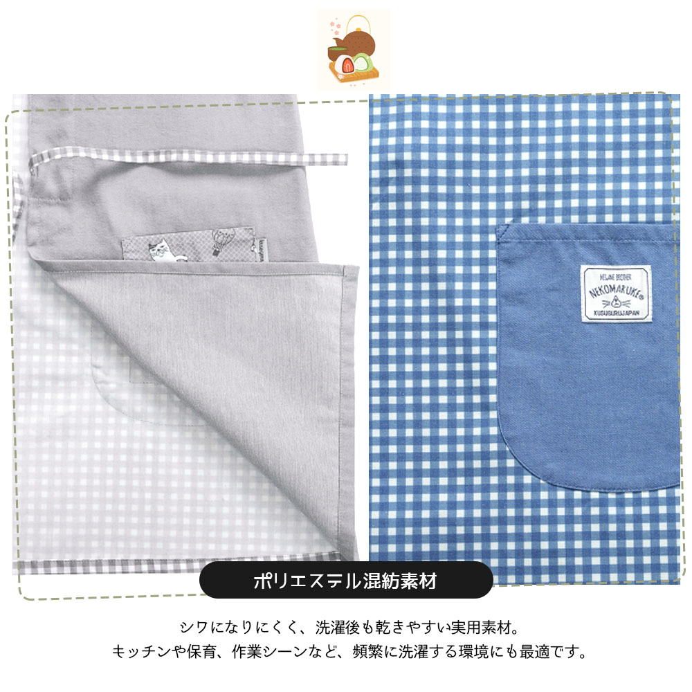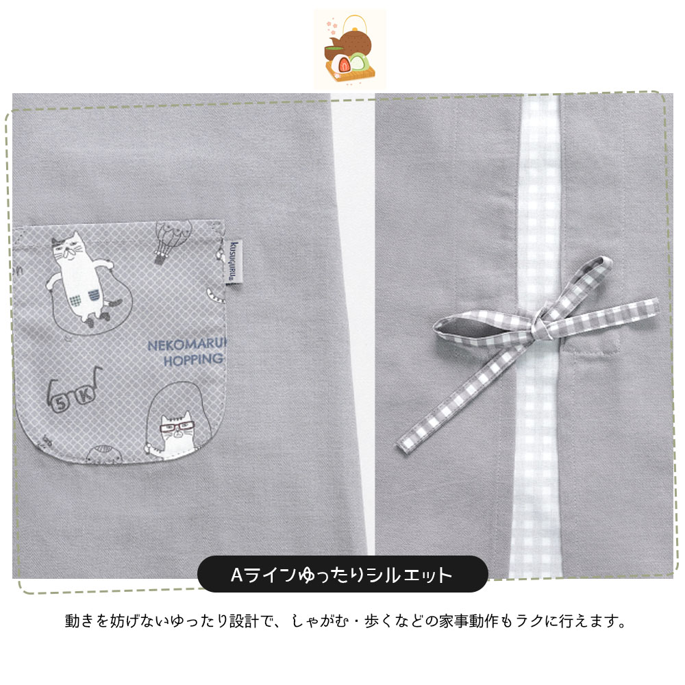 着脱しやすいサイドリボン仕様 脇で結ぶタイプ(サイドリボン)なので、結び目がお腹に当たらず、作業を邪魔しません。サイズ調整も簡単で、シルエットもすっきり見えます。