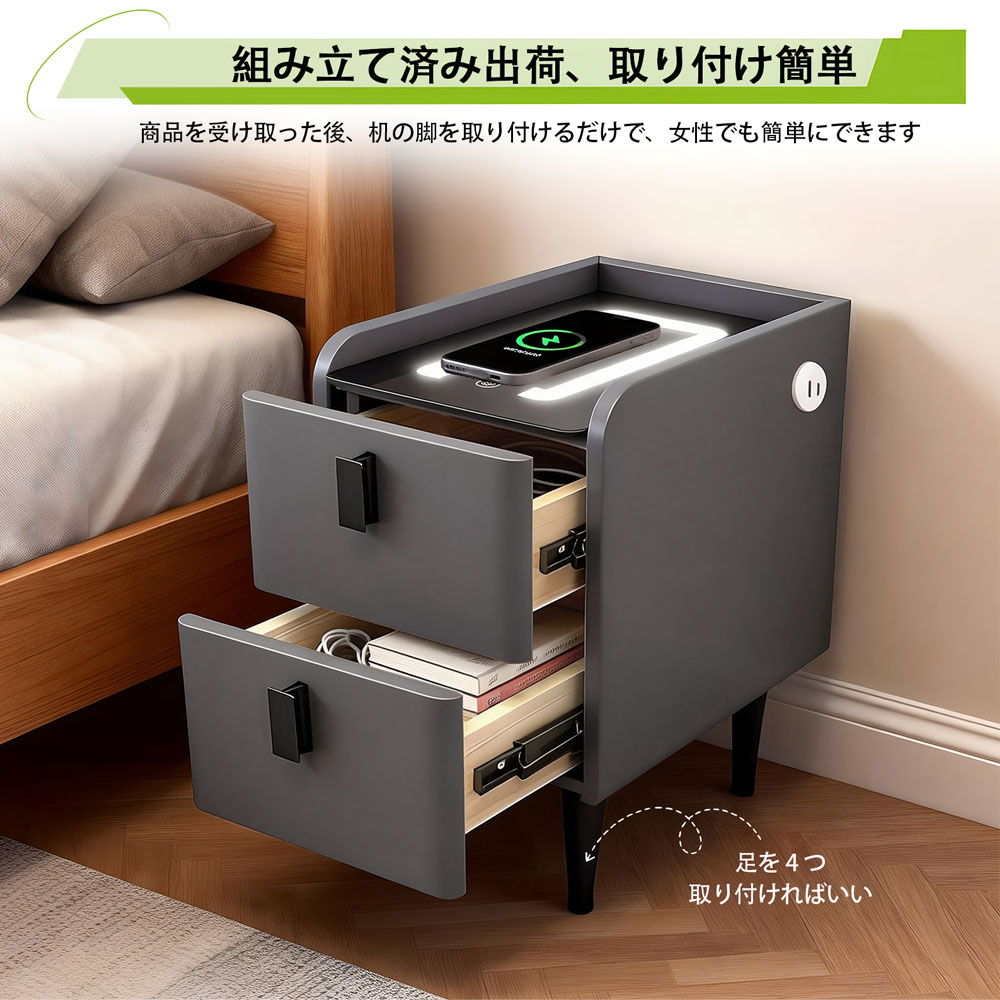 USBポート付きで、スマートフォン・タブレット・電子機器などを同時に充電可能。ベッドサイドでの充電をより便利にします。