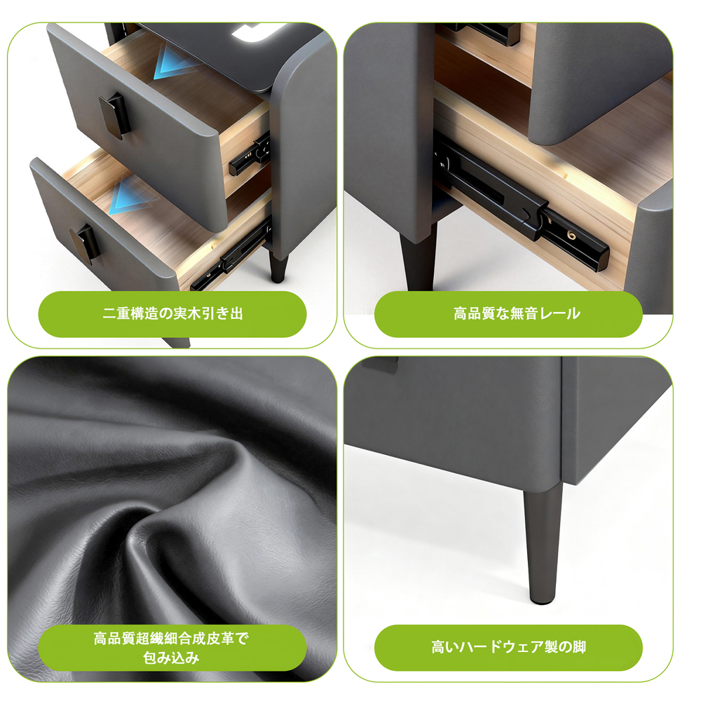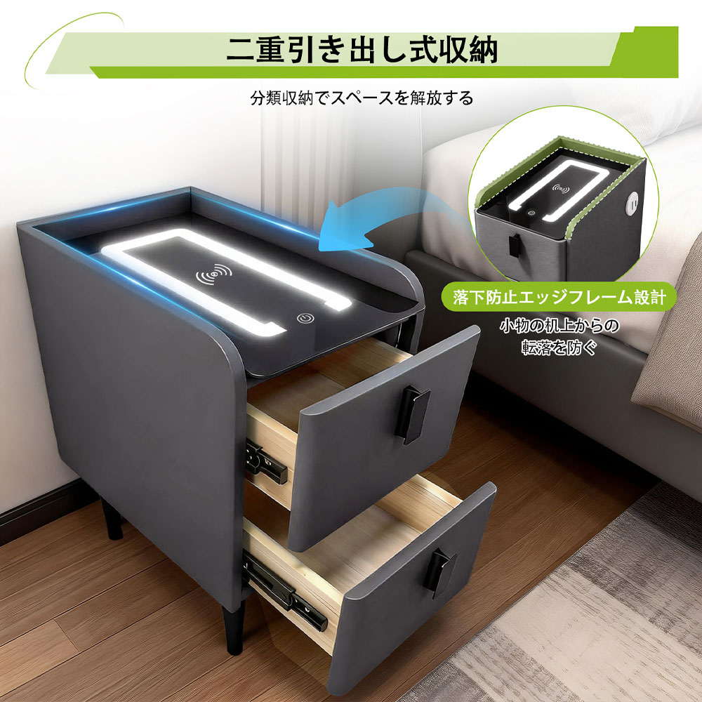 コンパクト設計ながら十分な収納力を実現。ベッドサイドテーブルとしてはもちろん、リビングのソファサイドテーブルとしても活躍し、上品で落ち着いた空間を演出します。
