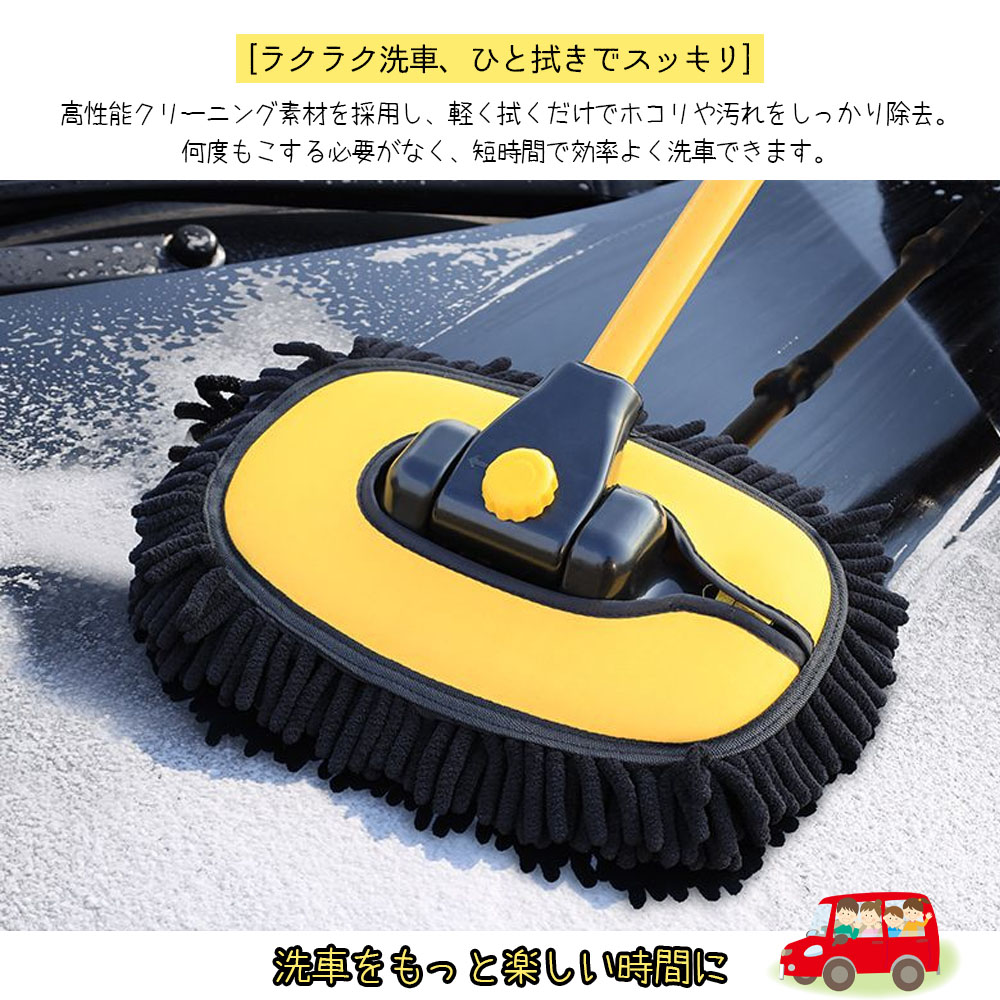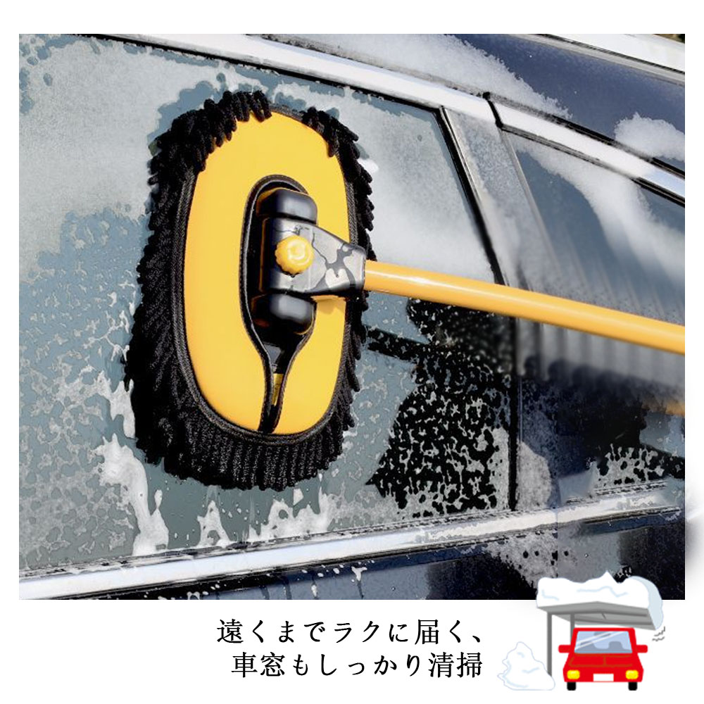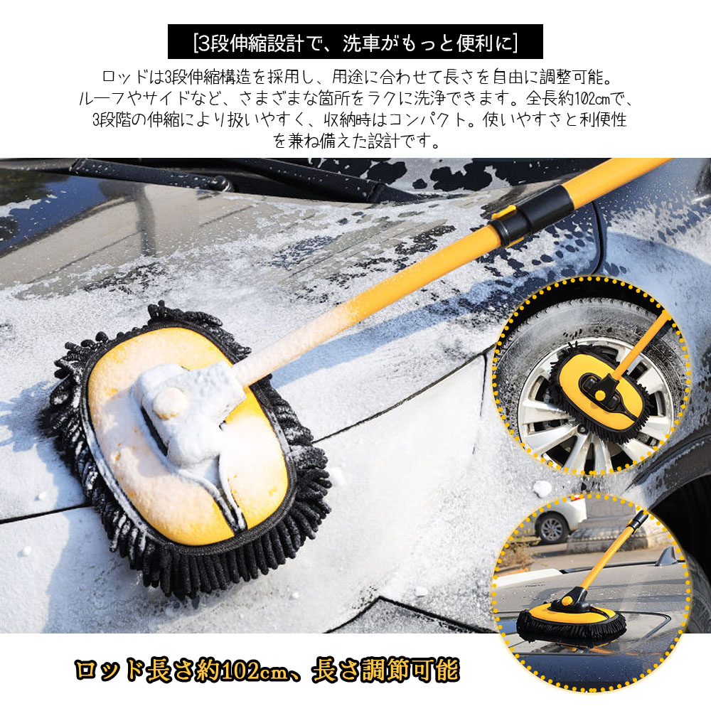 50cmから102cmまで自由に長さを調節可能。普通車から大型SUVまで、手が届きにくい**車頂(ルーフ)**やフロントガラスの中央も、踏み台を使わずに立ったままスムーズに洗えます。