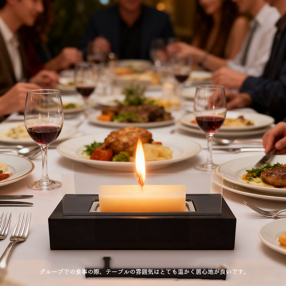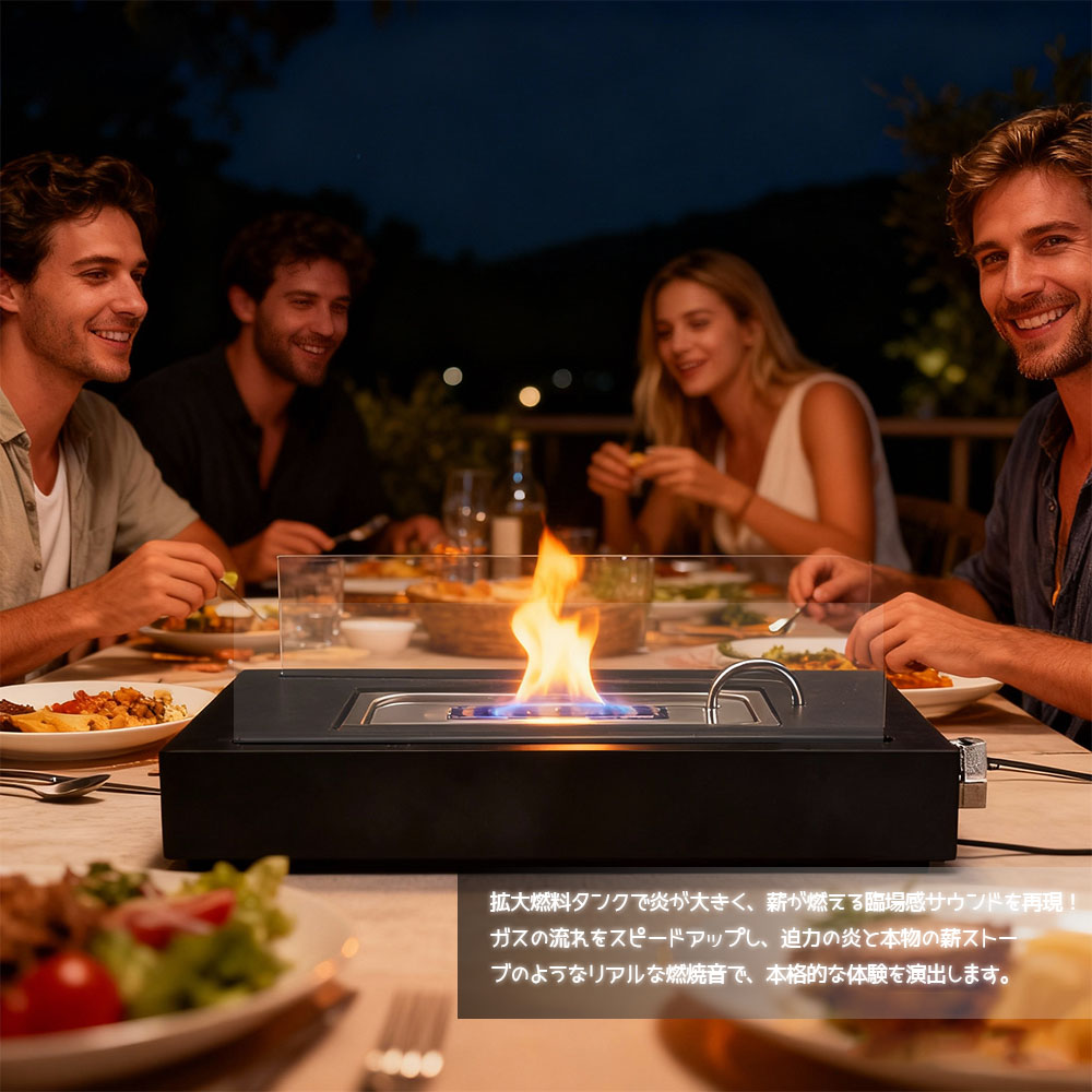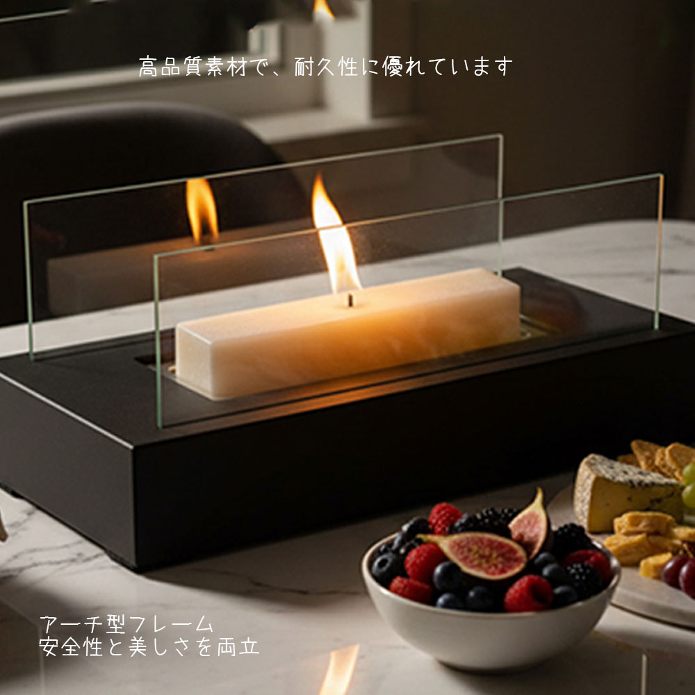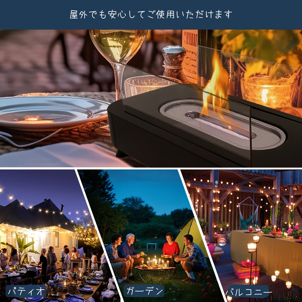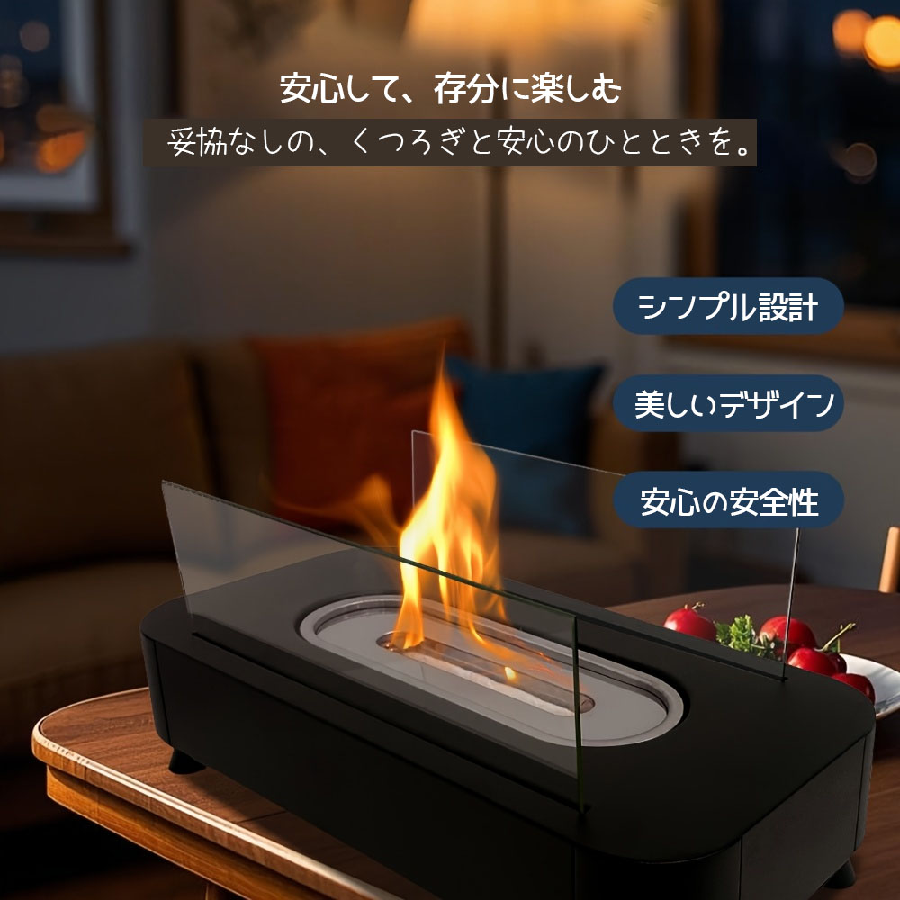 クリーンでエコロジー: 燃料にはバイオエタノールを使用。燃焼時に**「煙・臭い・灰」が出ない**ため、室内の空気を汚さず、面倒な後片付けも必要ありません。
