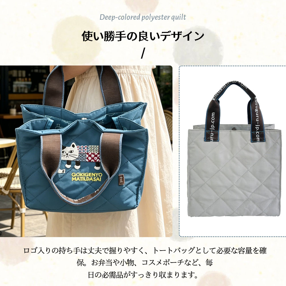 柔らかなキルティング生地に、ニット柄の猫が刺繍された愛らしいデザイン。グレー・ブラウン・ブルーの 3 色展開で、カジュアルからオフィスカジュアルまで、どんなコーデにも馴染みます。